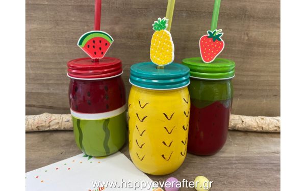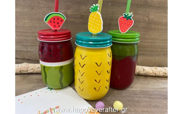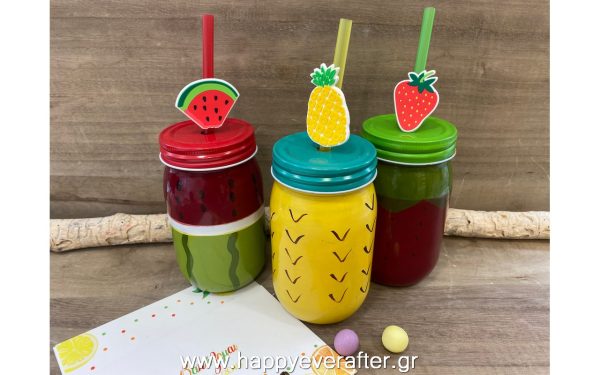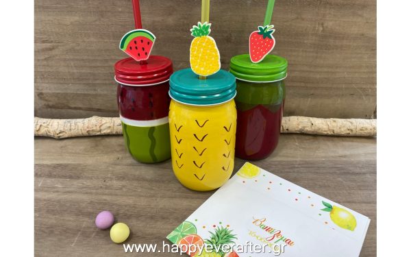Μπομπονιέρα γυάλινο χρωματιστό ποτήρι με καλαμάκι σε σχέδια φρούτων: φράουλα, καρπούζι και ανανά. Διαθέσιμο σε σετ τριών σχεδίων.