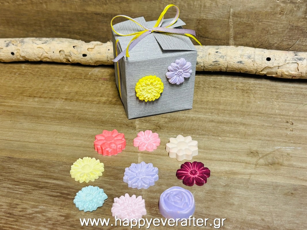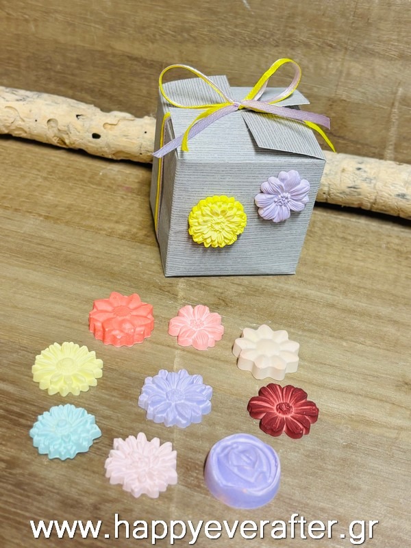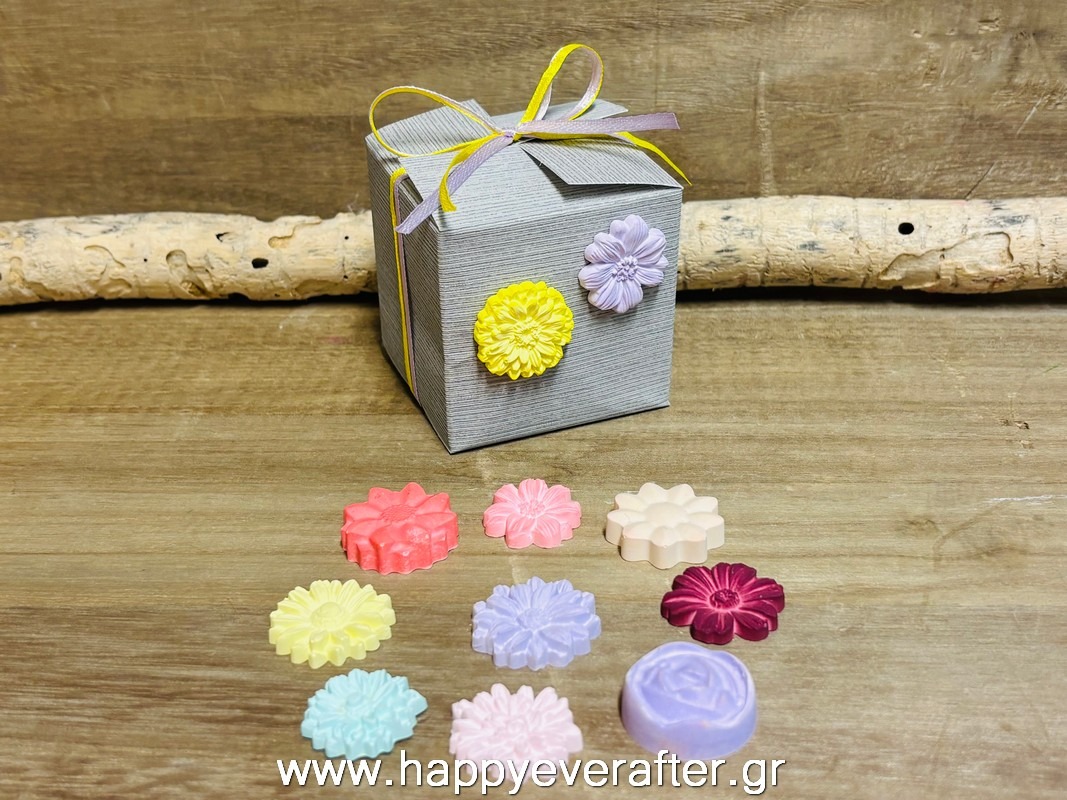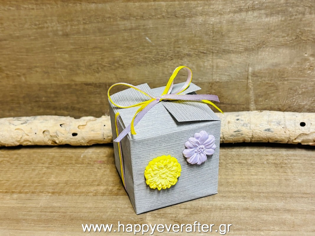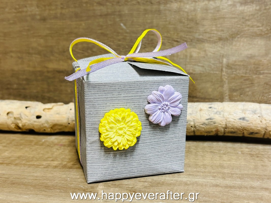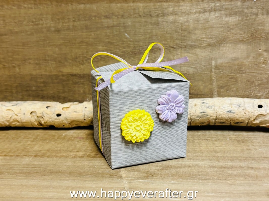 Μπομπονιέρα κουτάκι με διακοσμητικά πορσελάνινα λουλουδάκια! Τα λουλουδάκια είναι σετ 10 σχεδίων. Το κουτάκι είναι διαθέσιμο σε πολλά χρώματα! Επιλέξτε το χρώμα στο κουτάκι! Τα λουλουδάκια είναι διαθέσιμα σε λευκό, κίτρινο, κεραμιδί και γκρι. Τα λουλουδάκια συμπεριλαμβάνεται στην τιμή σε λευκό, κίτρινο, κεραμιδί ή γκρι. Τα λουλουδάκια είναι διαθέσιμα και σε άλλα χρώματα με επιπλέον χρέωση 0,20€ έκαστο.