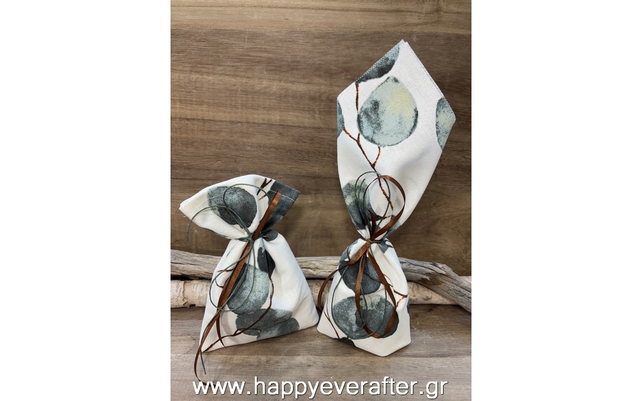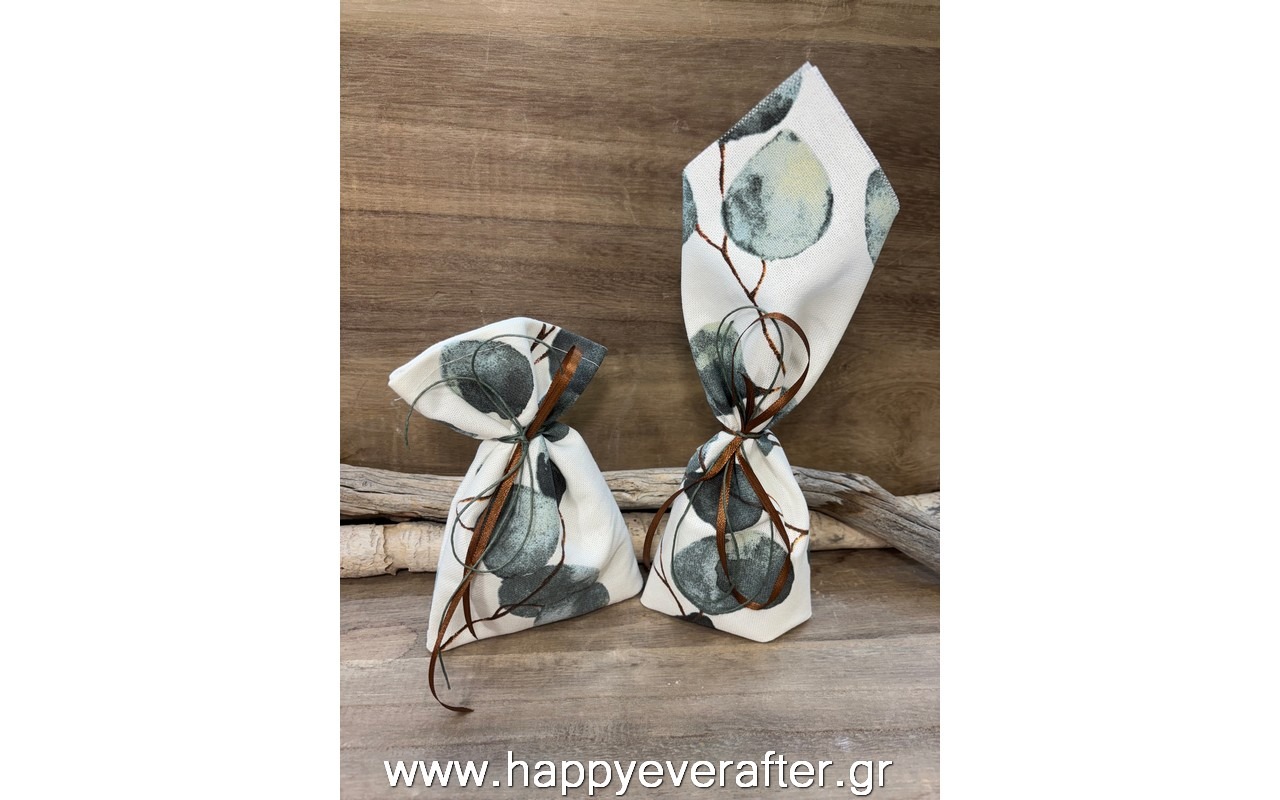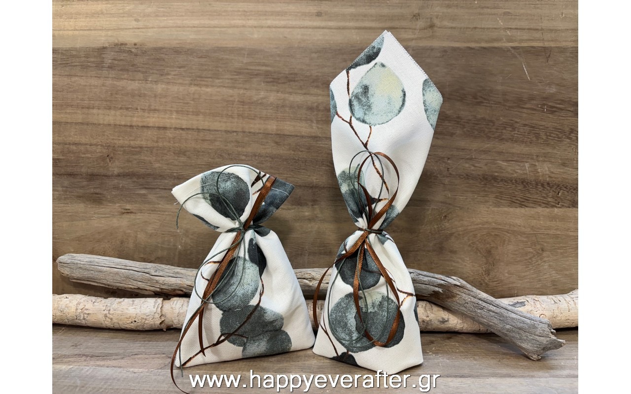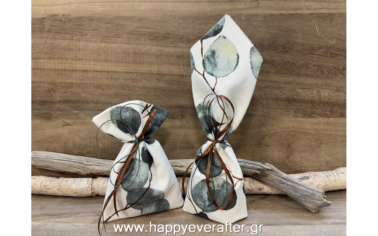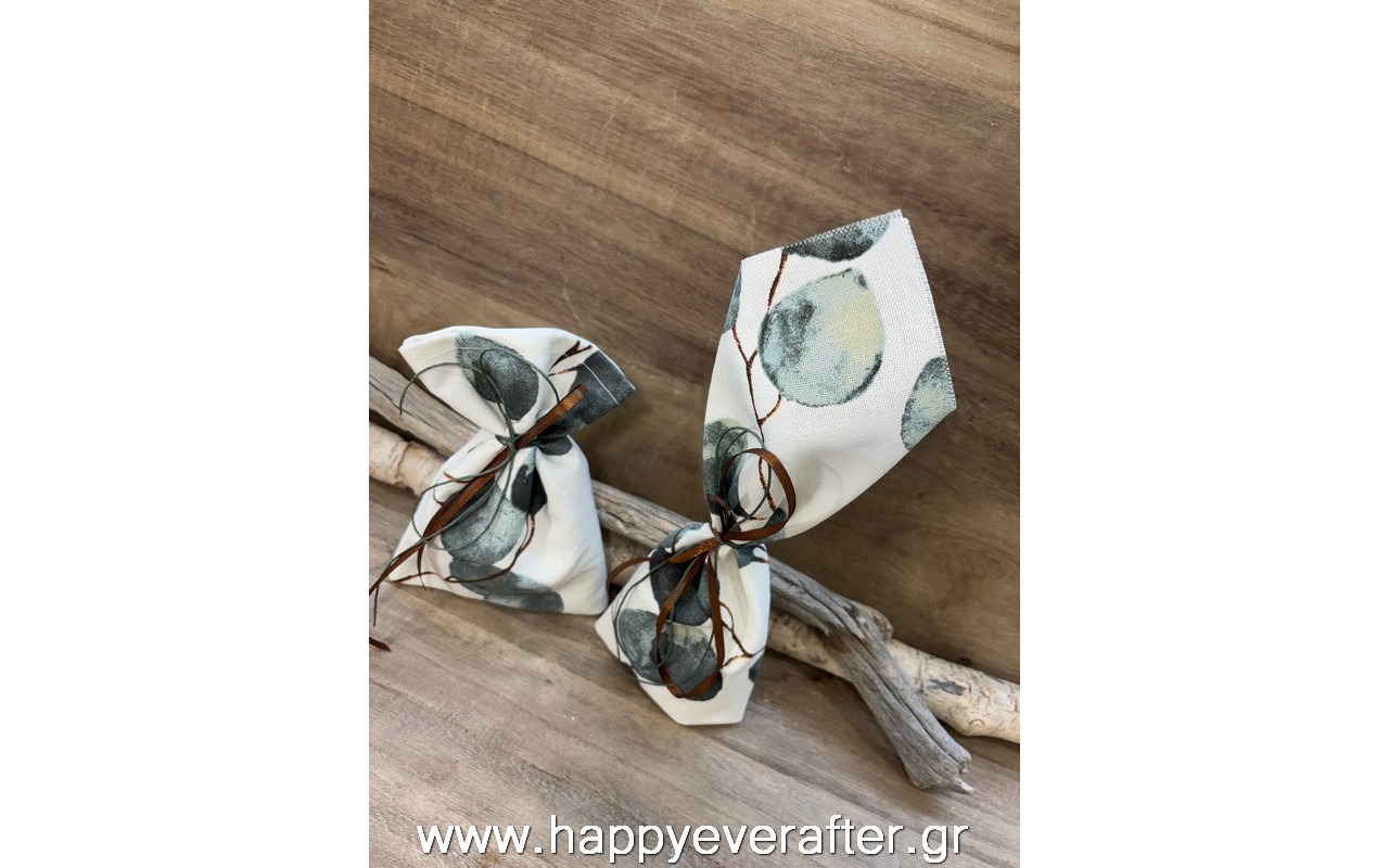 Μπομπονιέρα πουγκί και μαντήλι με εκτύπωση φύλλα ευκάλυπτου.