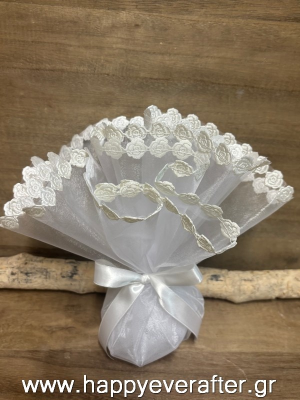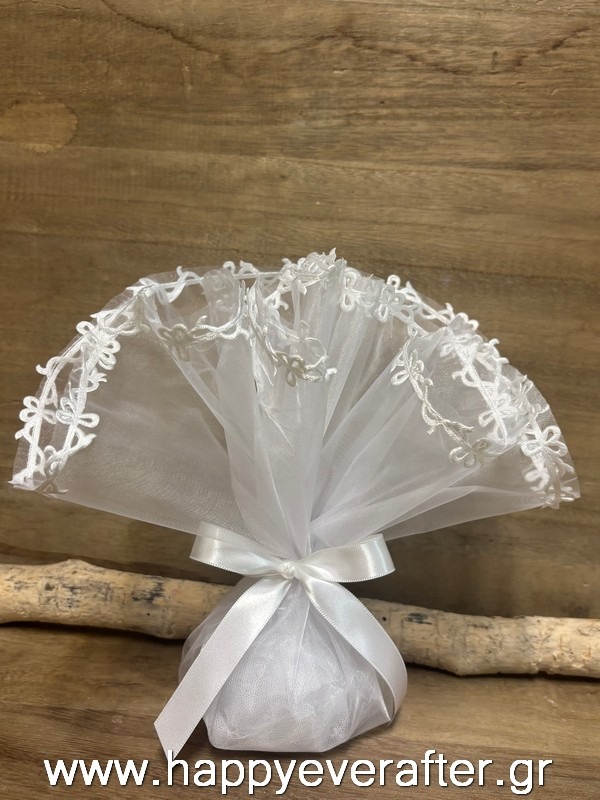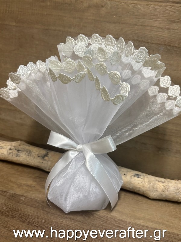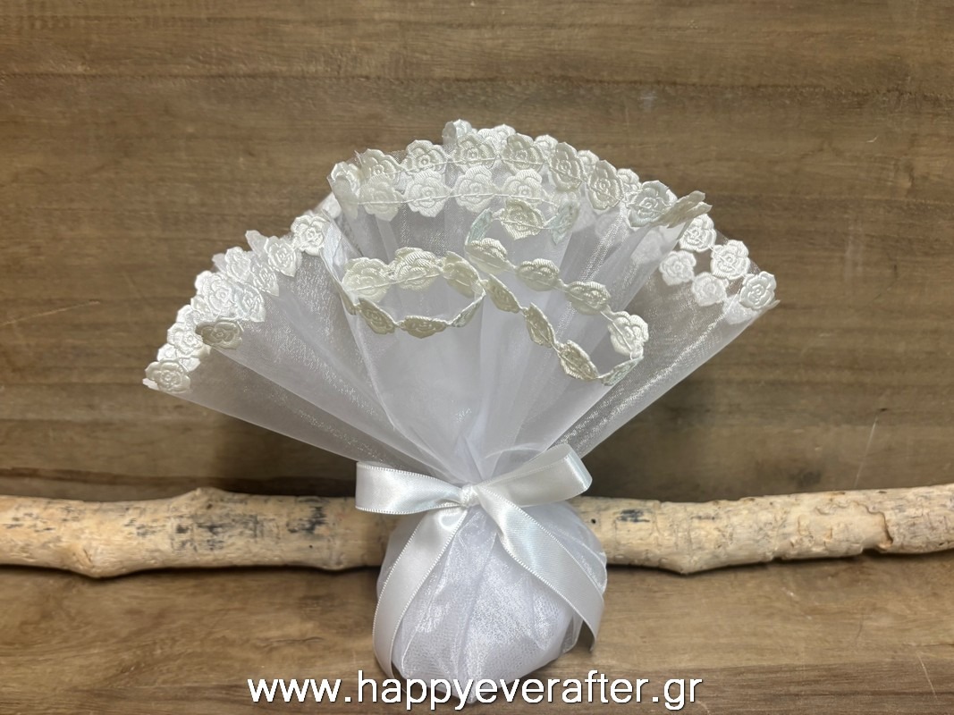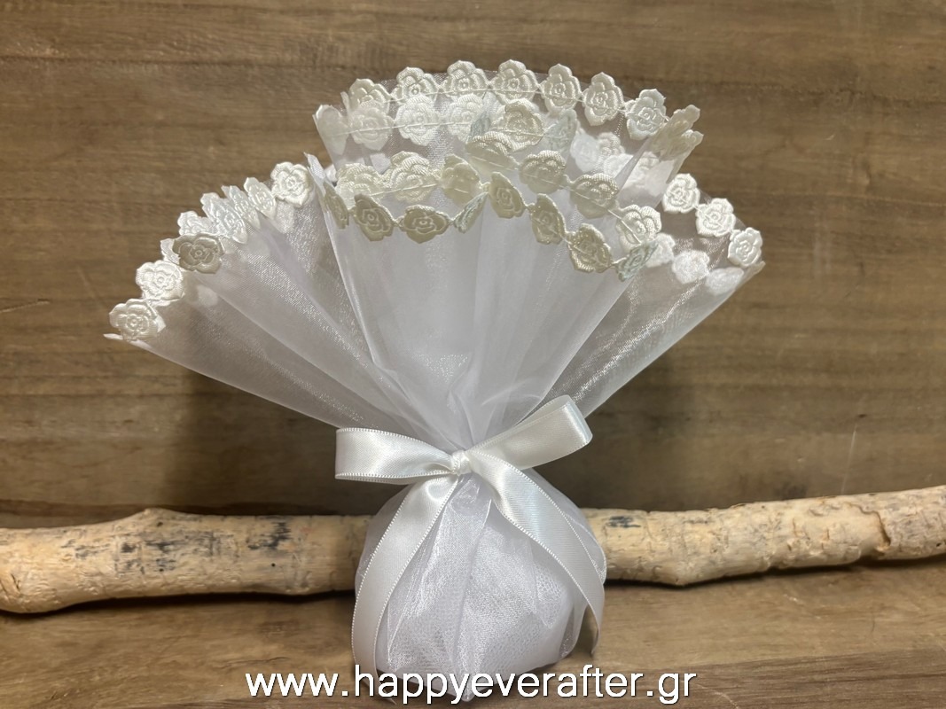 Μπομπονιέρα μαντήλι από λευκή οργάντζα με τελείωμα κορδέλας σε 2 σχέδια: ακανόνιστα φιογκάκια (ΓΥ0068) και τριανταφυλλάκια (ΓΥ0069).