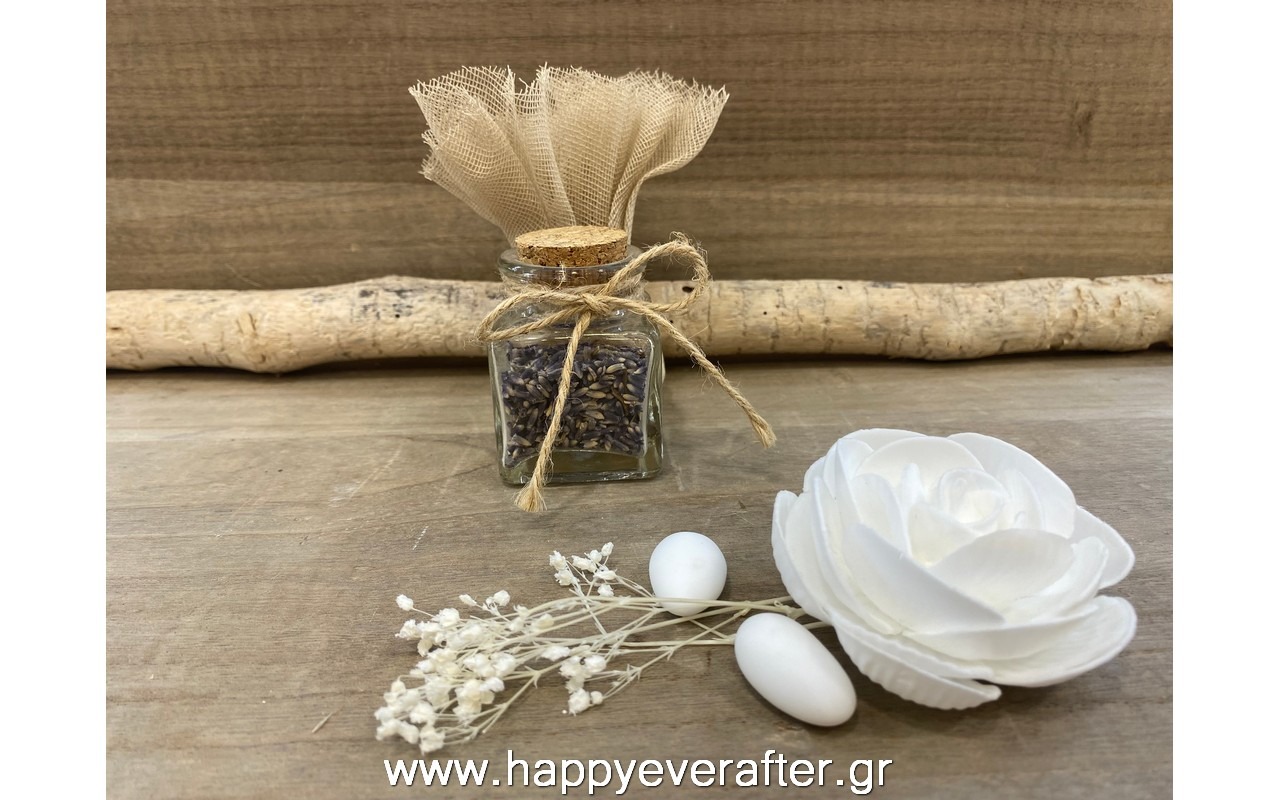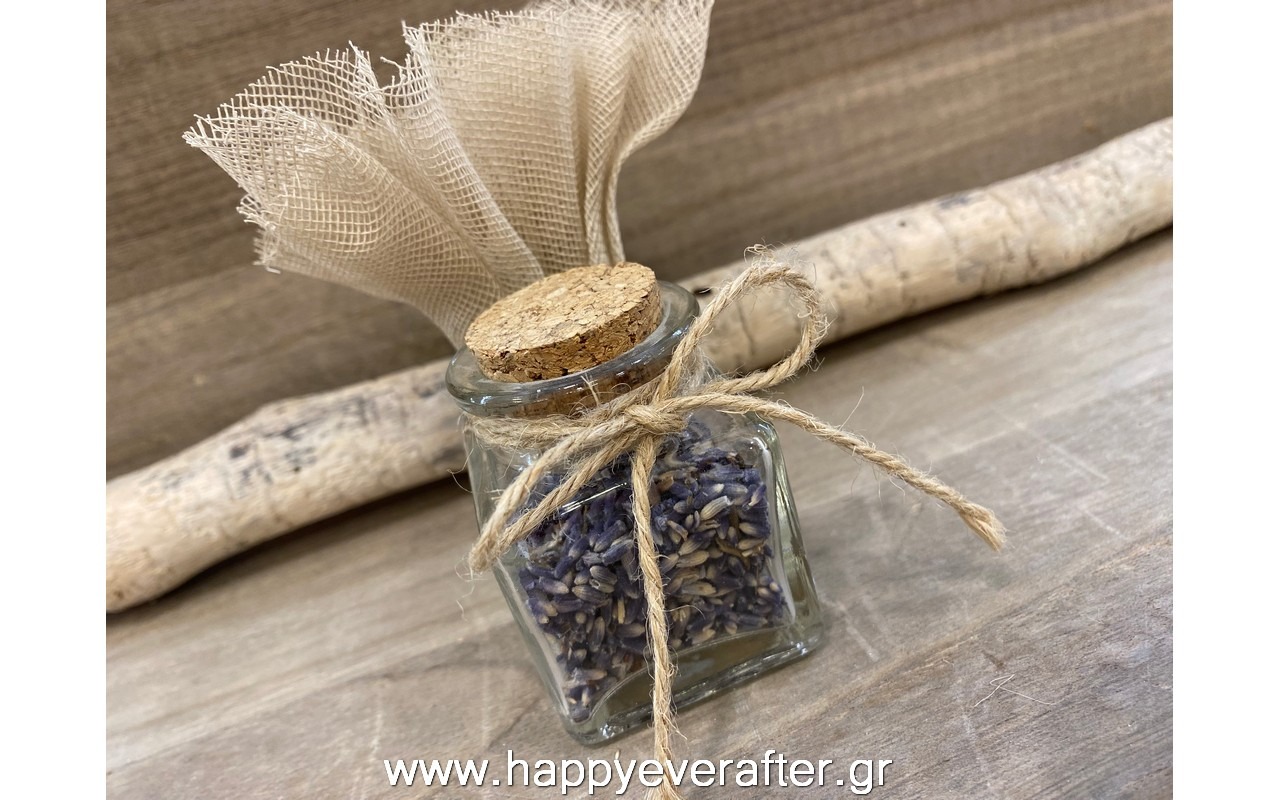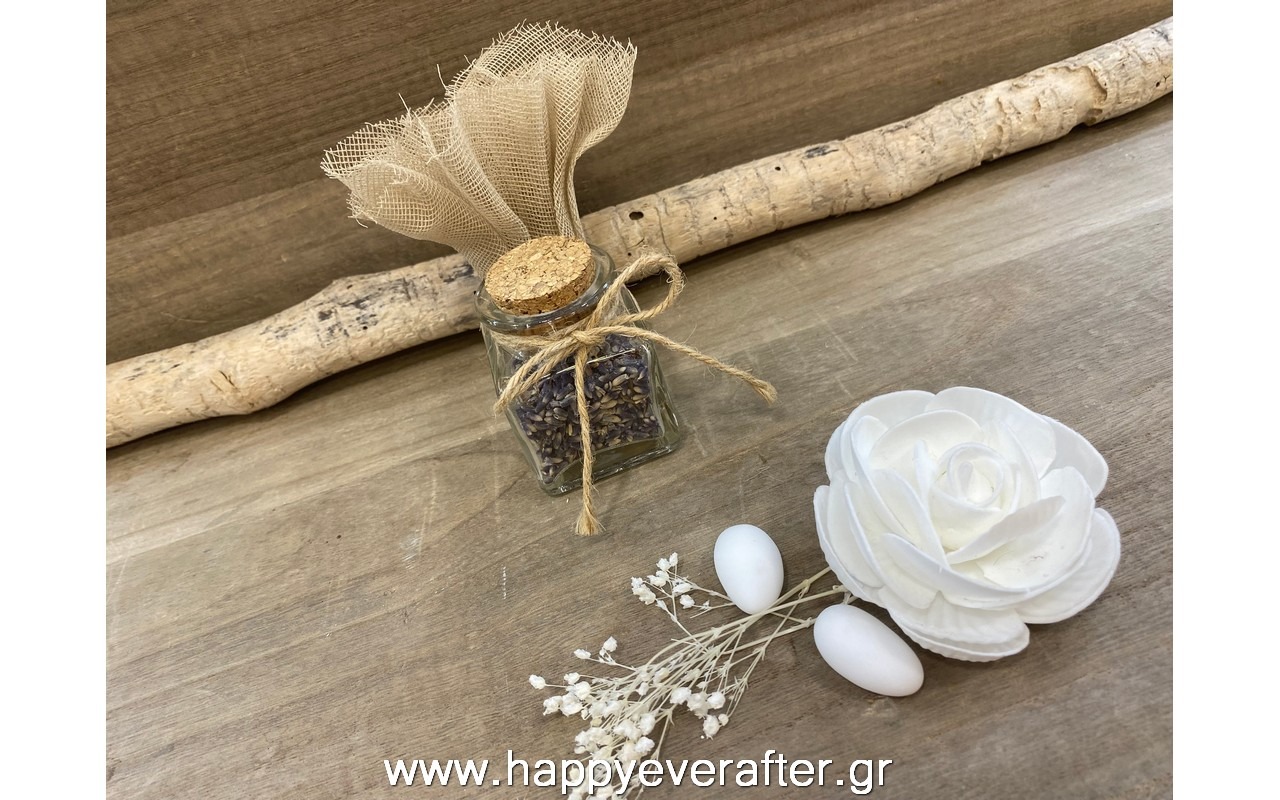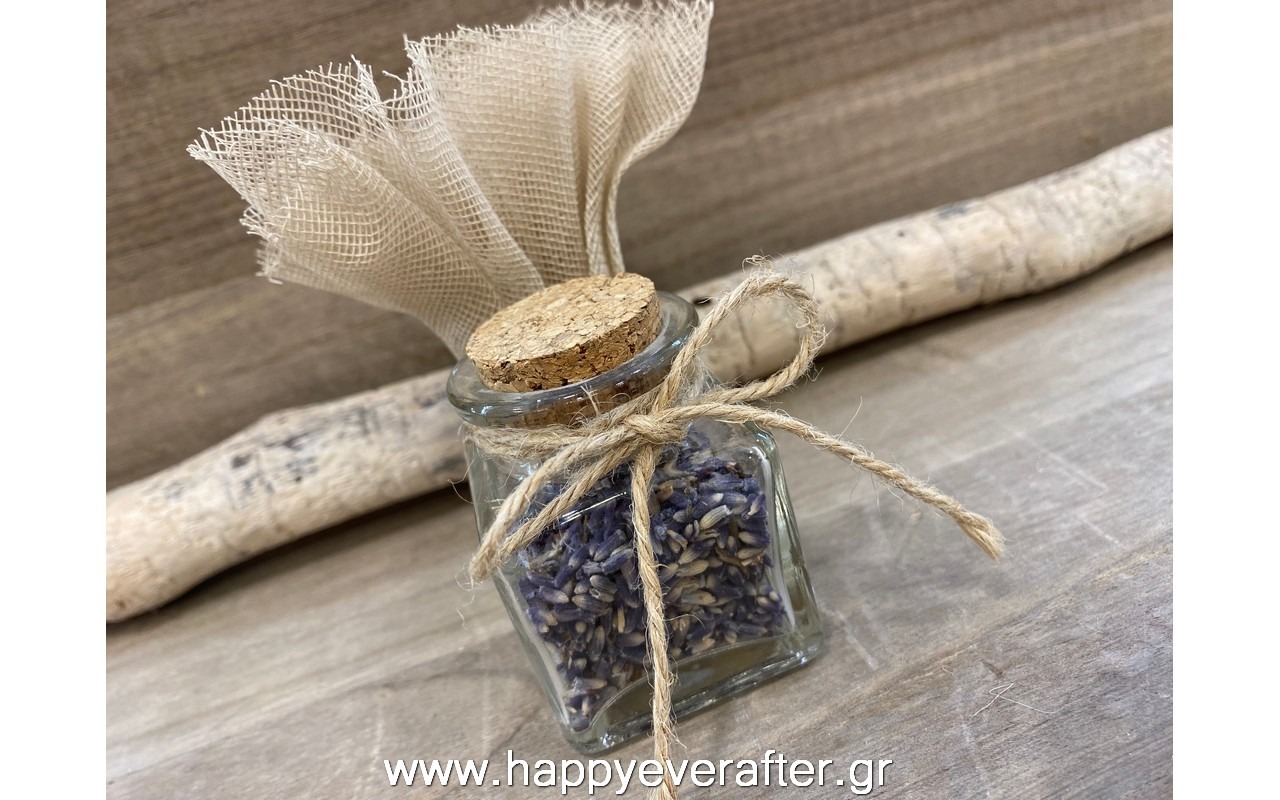 Μπομπονιέρα τετράγωνο βαζάκι με φελλό με μυρωδικά. Επιλέξτε το μυρωδικό που προτιμάτε: λεβάντα, δυόσμο, βασιλικό, δενδρολίβανο ή λουίζα.