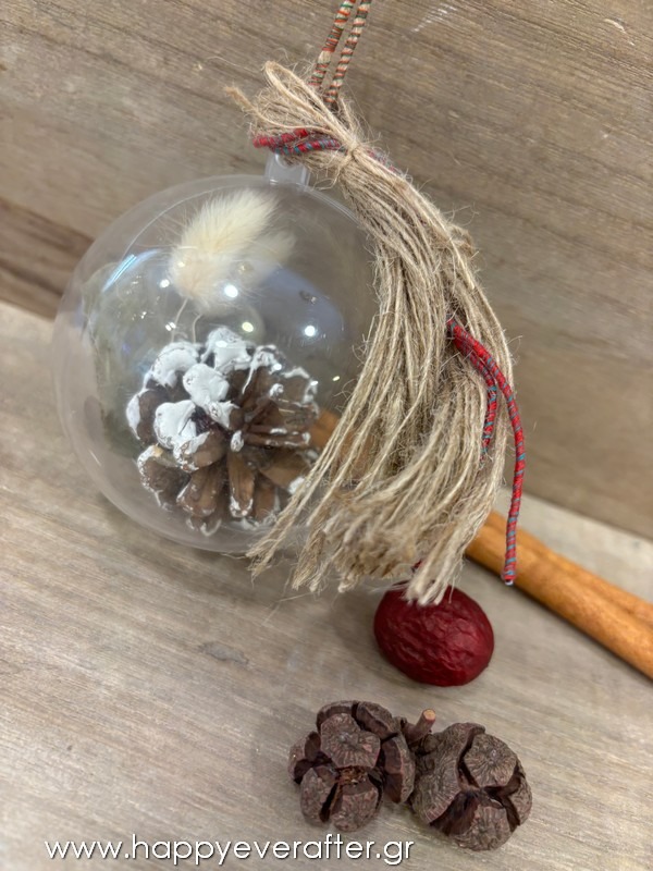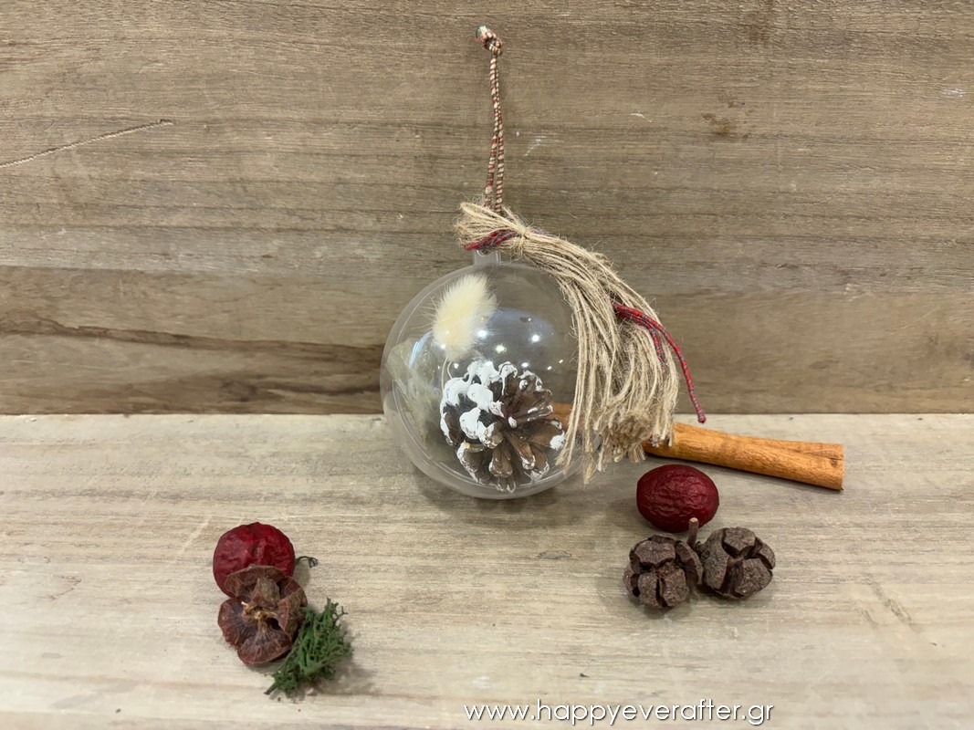 Μπομπονιέρα χριστουγεννιάτικη μπάλα με κουκουνάρι, ευκάλυπτο & αποξηραμένα κλαδάκια! Διάμετρος μπάλας 8εκ. Συμπεριλαμβάνονται 3 κλασικά κουφέτα αμυγδάλου (βανίλια, φράουλα, καραμέλα) ή crispies Χατζηγιαννάκη!