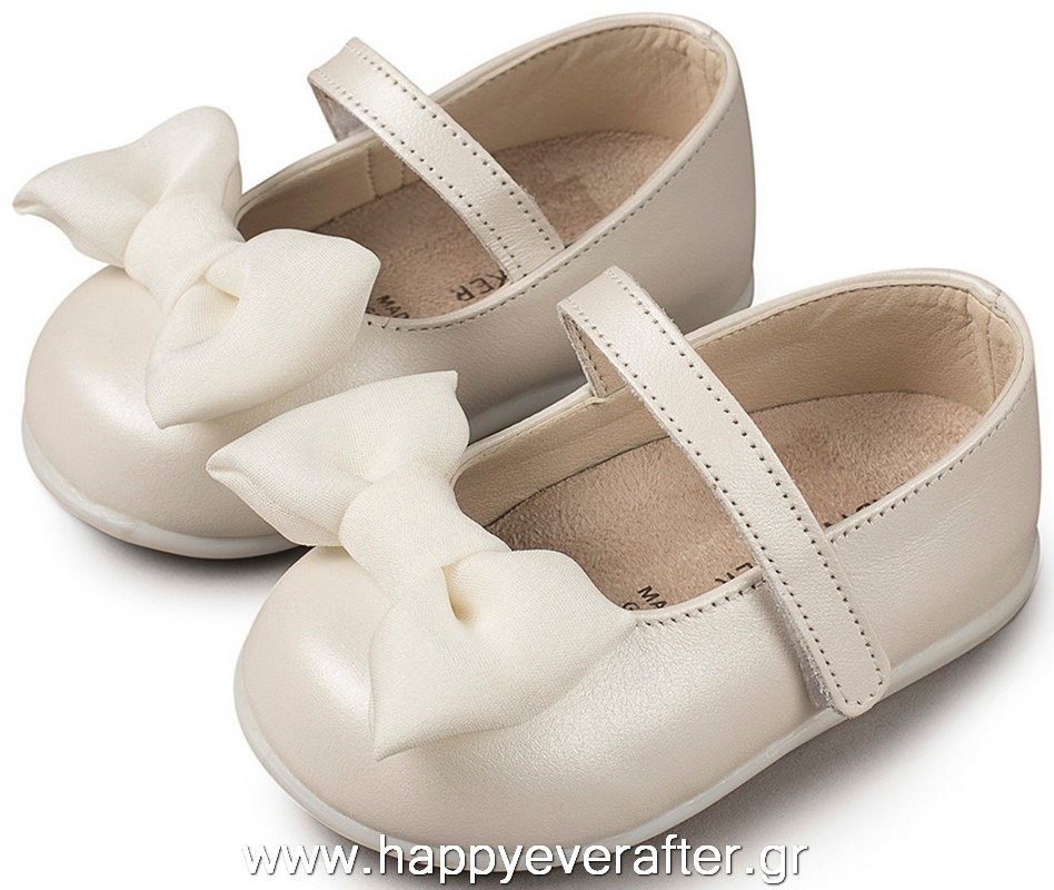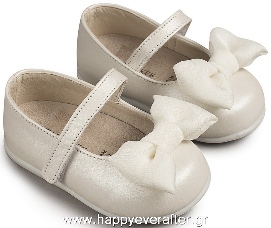 Εκρού Δερμάτινο Γοβάκι Μονή Μπαρέτα με Φιόγκο Οργάντζα από Δέρμα Πέρλα σε Εκρού Χρώμα