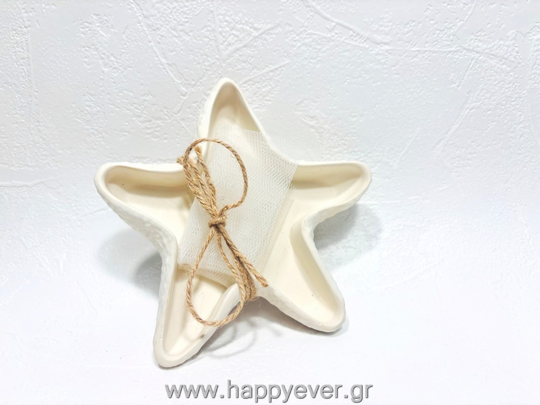 Μπομπονιέρα κεραμικό κασπώ αστερίας. Διαθέσιμο σε πολλά παλ χρώματα. Επιλέξτε το χρώμα του κεραμικού, της κορδέλας και του τουλιού! Συμπεριλαμβάνονται 3 κλασικά κουφέτα αμυγδάλου (βανίλια, φράουλα, καραμέλα) ή crispies Χατζηγιαννάκη.