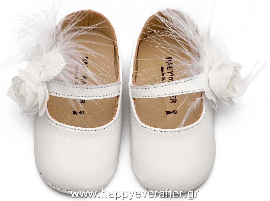 Λευκό Δερμάτινο Γοβάκι Μονή Μπαρέτα Διακοσμημένο με Λουλούδι και Πούπουλα σε Λευκό Χρώμα