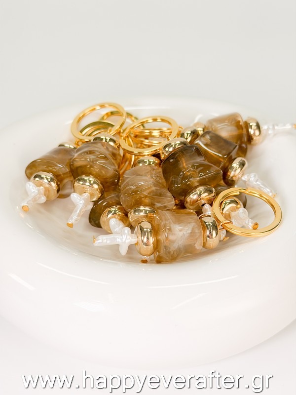 Μαρτυρικό μπρελόκ με ακρυλική μεγάλη καφέ χάντρα,μεγαλη χρυσή ροδέλα και περλέ σταυρό.