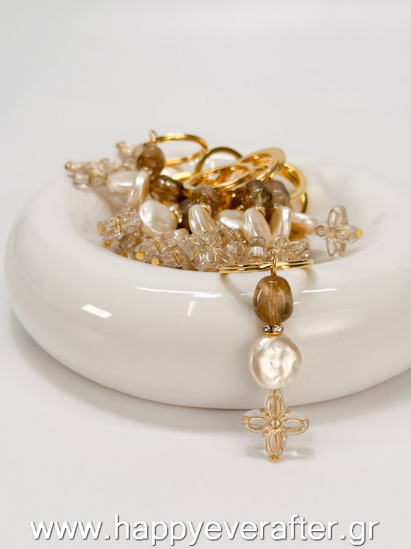 Μαρτυρικό μπρελόκ με καφέ ακρυλική χάντρα,ροδέλα με στρας,πλακε στρογγυλή πέρλα και ακρυλικό σταύρο σε σχήμα λουλουδιού.