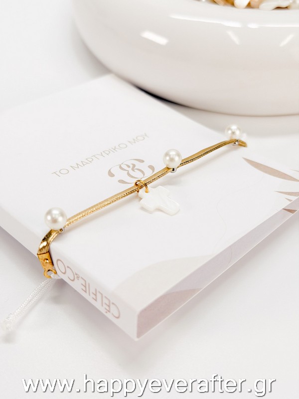 Μαρτυρικό βραχιόλι με χρυσό κορδόνι με πέρλες,φίλντισι σταυρό και λευκό σατέν δέσιμο.