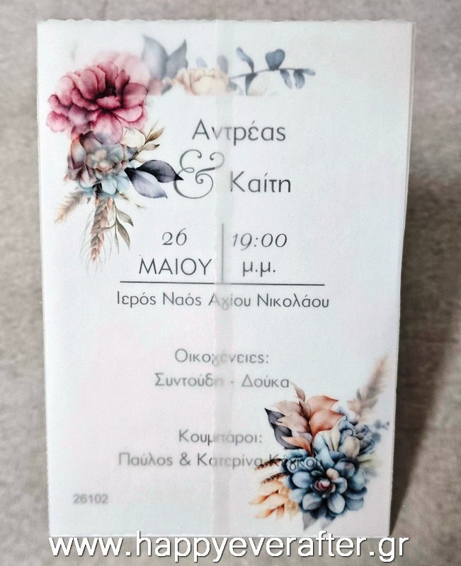 Ελάχιστη παραγγελία 80τμχ. Συνδυάστε το προσκλητήριό σας με μπομπονιέρα με ίδια εκτύπωση (σουβέρ στρογγυλό, σουβέρ τετράγωνο, σουβέρ με plexiglass ονόματα, μπιζουτιέρα μακαρόν, μπιζουτιέρα τετραγωνισμένη).
