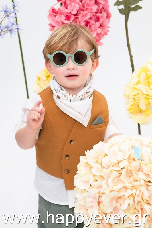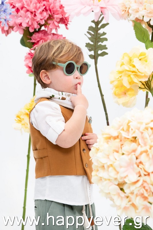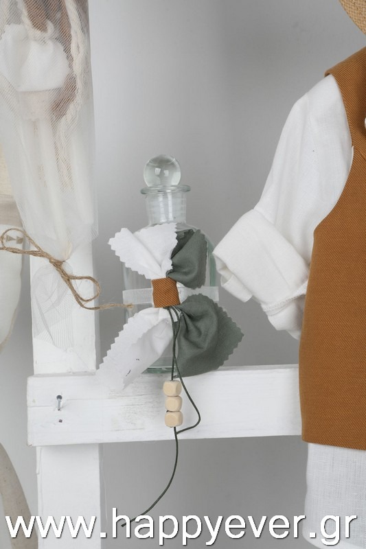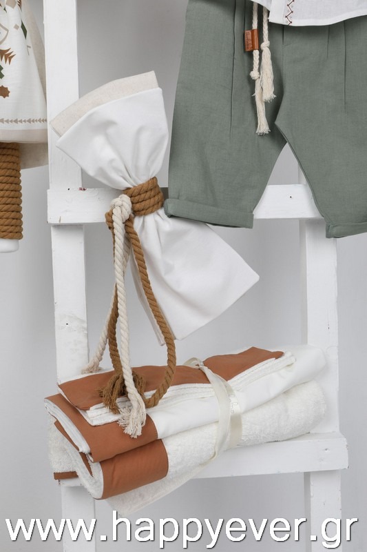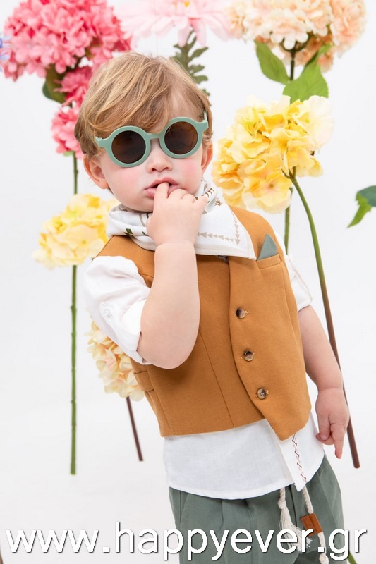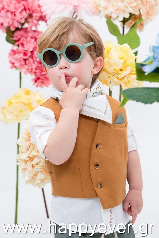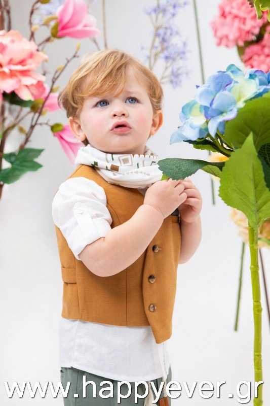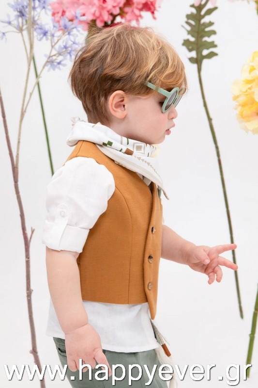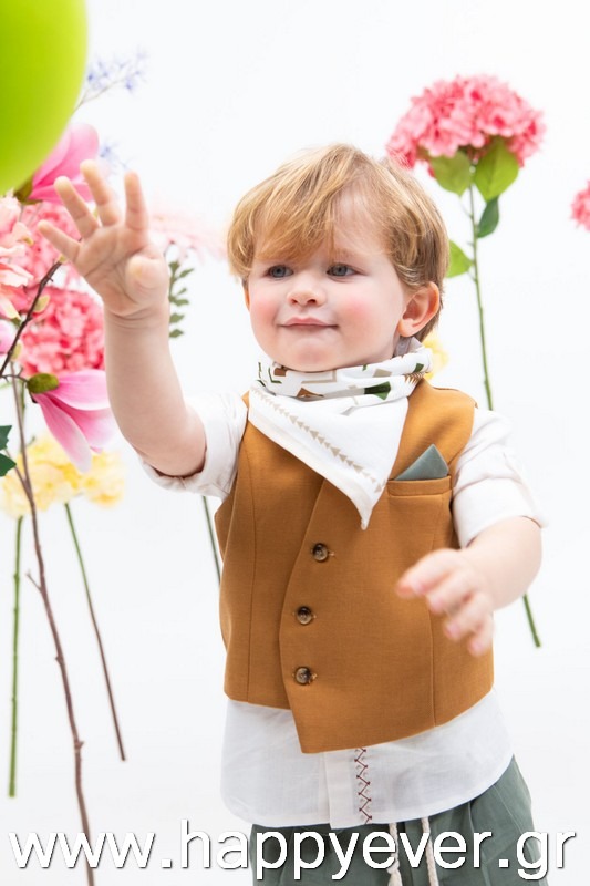 Ο Daniel είναι μία πολύ μοντέρνα και chic πρόταση βάπτισης. Αποτελείται από πράσινο λινό παντελόνι, λευκό λινό πουκάμισο με κέντημα εξαιρετικής ποιότητας και κεραμιδί στραβό γιλέκο διακοσμημένο με όμορφα κουμπιά. Αξεσουάρ είναι το εκρού-ταμπά κορδόνι για ζώνη, το μελί καβούρι και το printed φουλάρι.