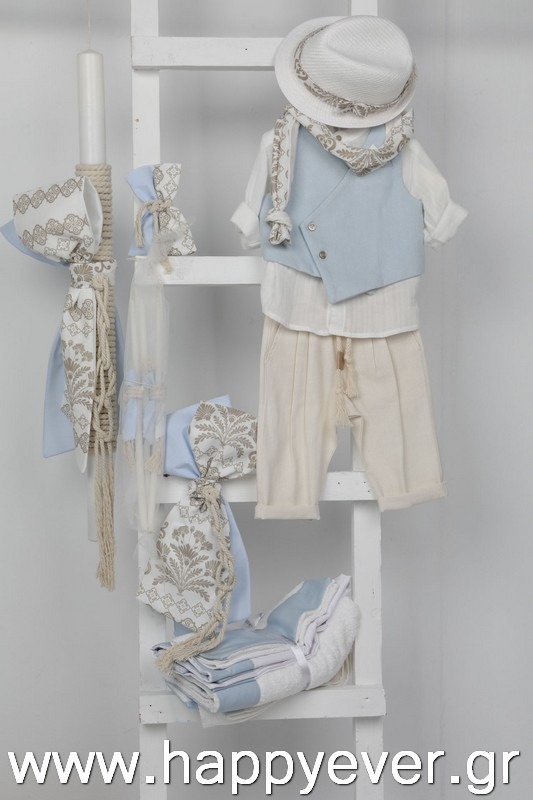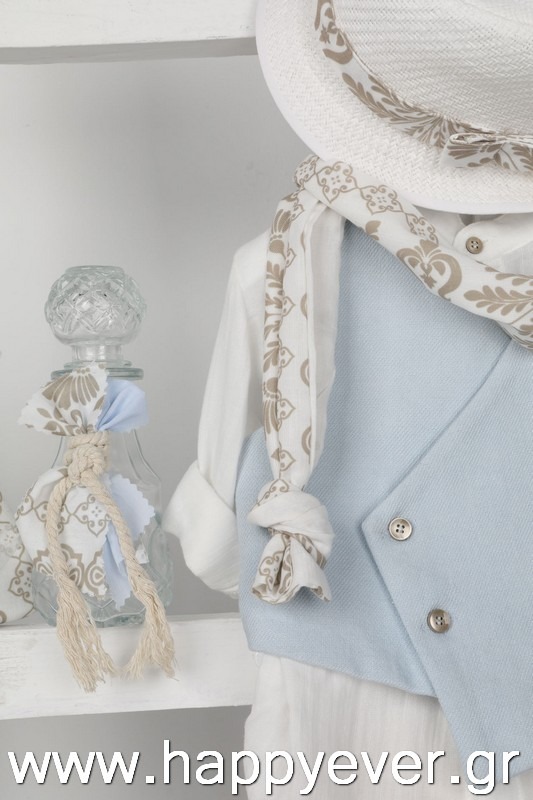 Ο Emerson είναι ένας classic but modern συνδυασμός βάπτισης. Αποτελείται από εκρού παντελόνι με πιέτες, εκρού γάζα πουκάμισο με μάο γιακά και στραβό σιέλ γιλέκο διακοσμημένο με κουμπιά. Αξεσουάρ είναι το εκρού-μπεζ κορδόνι για ζώνη, το λευκό καβούρι και το printed φουλάρι του.