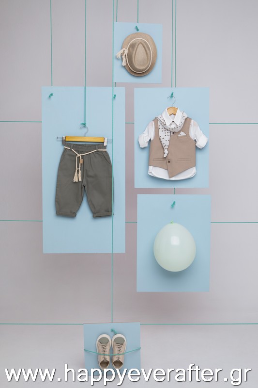 Γιλέκο σε μπεζ χρώμα από alternative καπαρντίνα με ιδιαίτερα κουμπιά. Πουκάμισο λευκό cotton 100%. Παντελόνι λαδί από diagonal καπαρντίνα με μπεζ κορδόνι για ζώνη. Φουλάρι και μαντήλι εκρού με printed καφέ αστέρια. Καπέλo ψάθινο σε φυσικό χρώμα με εκρού κορδόνι.