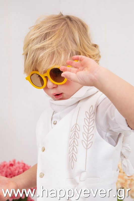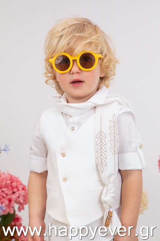 Ο Nikolas είναι το απόλυτο ολόλευκο βαπτιστικό κοστούμι με μπεζ λεπτομέρειες. Συγκεκριμένα, αποτελείται από λευκή καπαρντίνα παντελόνι με πιέτες και λάστιχο στην μέση, λευκό πουκάμισο και λευκό ψάθα στραβό γιλέκο το οποίο είναι διακοσμημένο με elegant κουμπιά. Αξεσουάρ είναι το μοναδικό λευκό φουλάρι με μπεζ κέντημα, το μπεζ κορδόνι για ζώνη και το λευκό καβούρι.