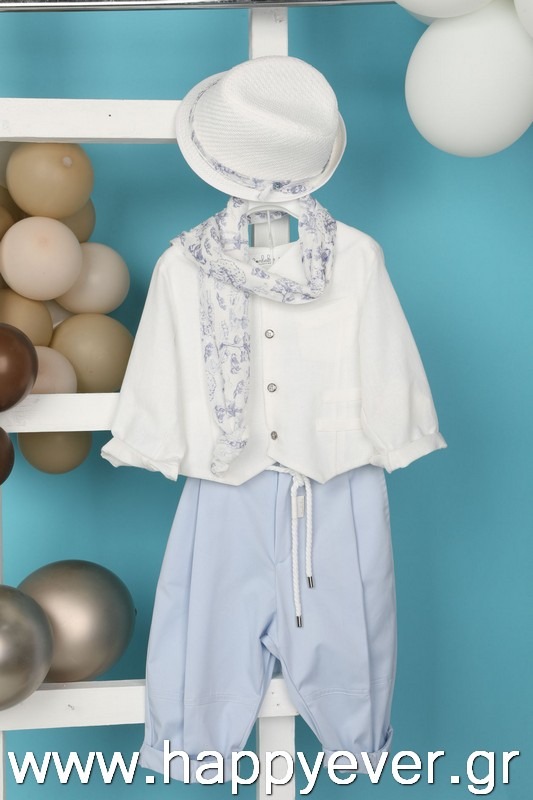Ο Othonas είναι μία νέα πρόταση για βαπτιστικό σετ με πολύ στυλ και φινέτσα. Αποτελείται από σιέλ καπαρντίνα παντελόνι και λευκό λινό πουκαμισογιλέκο εξαιρετικής ποιότητας. Αξεσουάρ είναι το λευκό κορδόνι για ζώνη, το μωβ φουλάρι με σχέδιο και το λευκό καβούρι του.