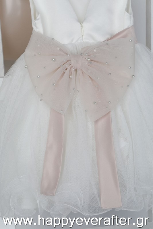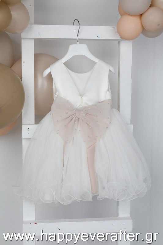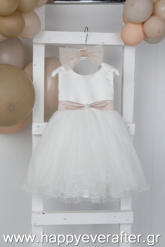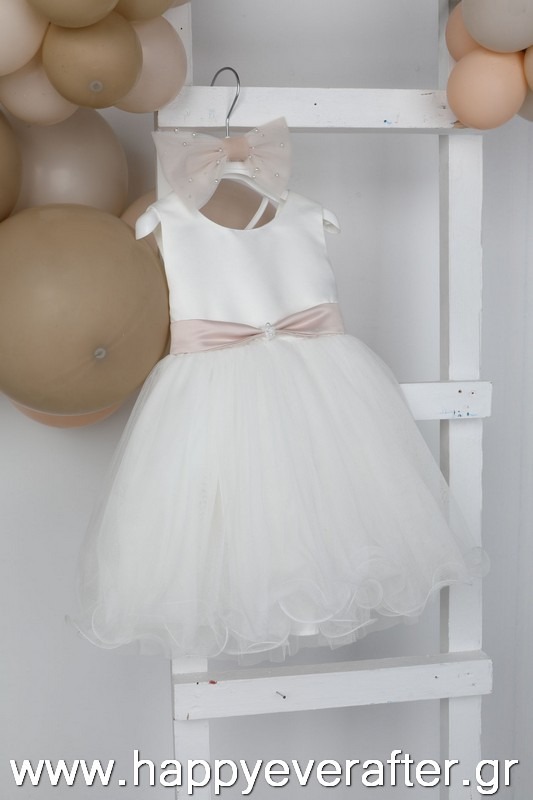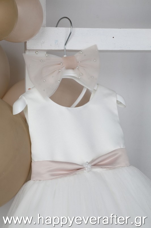 Η Selini είναι ένα exclusive εκρού φόρεμα βάπτισης. Το σατέν μπούστο με την τούλινη φούστα με το ιδιαίτερο τελείωμα και ο τεράστιος φιόγκος σε old pink χρώμα και πέρλες το απογειώνει. Το σύνολο ολοκληρώνεται με στέκα και φιόγκο για το κεφάλι.