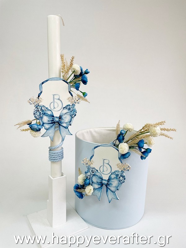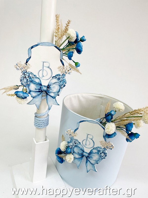 Τιμή σετ με ΦΠΑ 341€. Το σετ συμπεριλαμβάνει καλάθι με στολισμό Blue Bow, κλασική λαμπάδα με ξύλινο διακοσμητικό καδράκι και λαδοσέτ στολισμένο αντίστοιχα σε ξύλινη βάση.