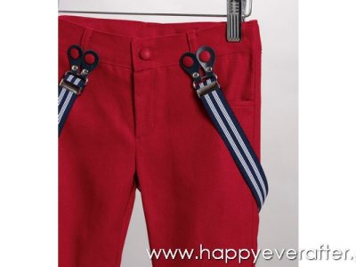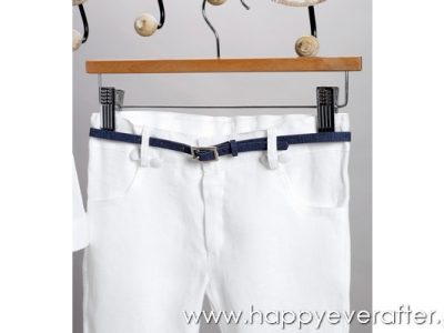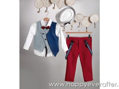 Παντελόνι καμπαρντίνα σε γκρι χρώμα. Εσωτερικά υπάρχει λάστιχο με κουμπότρυπα για τη ρύθμιση της μέσης. Διατίθεται επίσης σε άσπρο, μπεζ, βεραμάν, ραφ και μπλε χρώμα. Συνοδεύεται από σταθερή ζώνη. Πουκάμισο βαμβακερό ραφ μονόχρωμο. Εσωτερικά του μανικιού υπάρχει θυλάκι, για να στερεώνεται το μανίκι όταν είναι σηκωμένο. Διατίθεται σε πολλά χρώματα. Σακάκι καμπαρντίνα με σχέδιο ψιλό καρουδάκι σε γκρι χρώμα με δυο κρυφά τσεπάκια στα πλαϊνά. Διατίθεται επίσης σε εκρού, μπεζ, βεραμάν και ραφ χρώμα. Το σύνολο συνοδεύεται με υφασμάτινη γραβάτα και ψάθινο άσπρο καβουράκι με κορδέλα από το ύφασμα του παντελονιού.