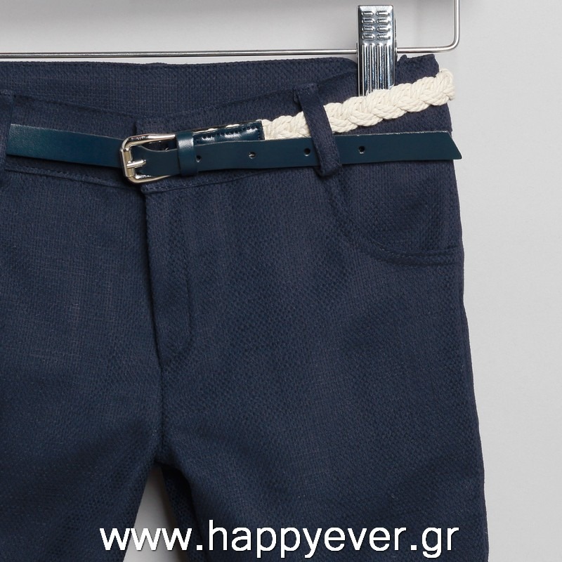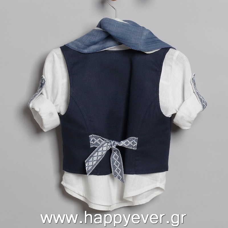Βερμούδα λινή καμβάς σε μπλε χρώμα. Εσωτερικά υπάρχει λάστιχο με κουμπότρυπα για τη ρύθμιση της μέσης. Διατίθεται επίσης σε εκρού και μπεζ χρώμα. Συνοδεύεται από σταθερή πλεκτή ζώνη. Πουκάμισο λινό σε άσπρο χρώμα. Εσωτερικά του μανικιού υπάρχει θυλάκι, για να στερεώνεται το μανίκι όταν είναι σηκωμένο. Διατίθεται σε πολλά χρώματα. Γιλέκο λινό καμβάς σε μπλε χρώμα με δυο τσεπάκια με ραμμένη κορδέλα στα πλαϊνά. Η ίδια κορδέλα υπάρχει και στο πίσω μέρος για να σφίγγει το γιλέκο. Διατίθεται επίσης σε εκρού και μπεζ χρώμα. Το σύνολο συνοδεύεται με διπλό φουλάρι και ψάθινο άσπρο καβουράκι με κορδέλα ίδια με αυτή που υπάρχει στο γιλέκο.