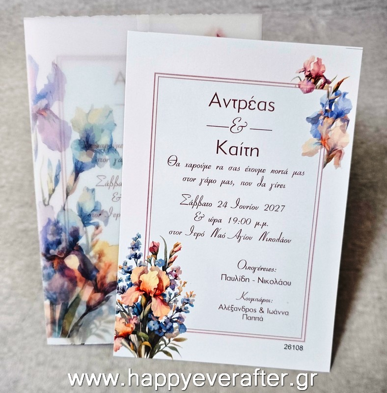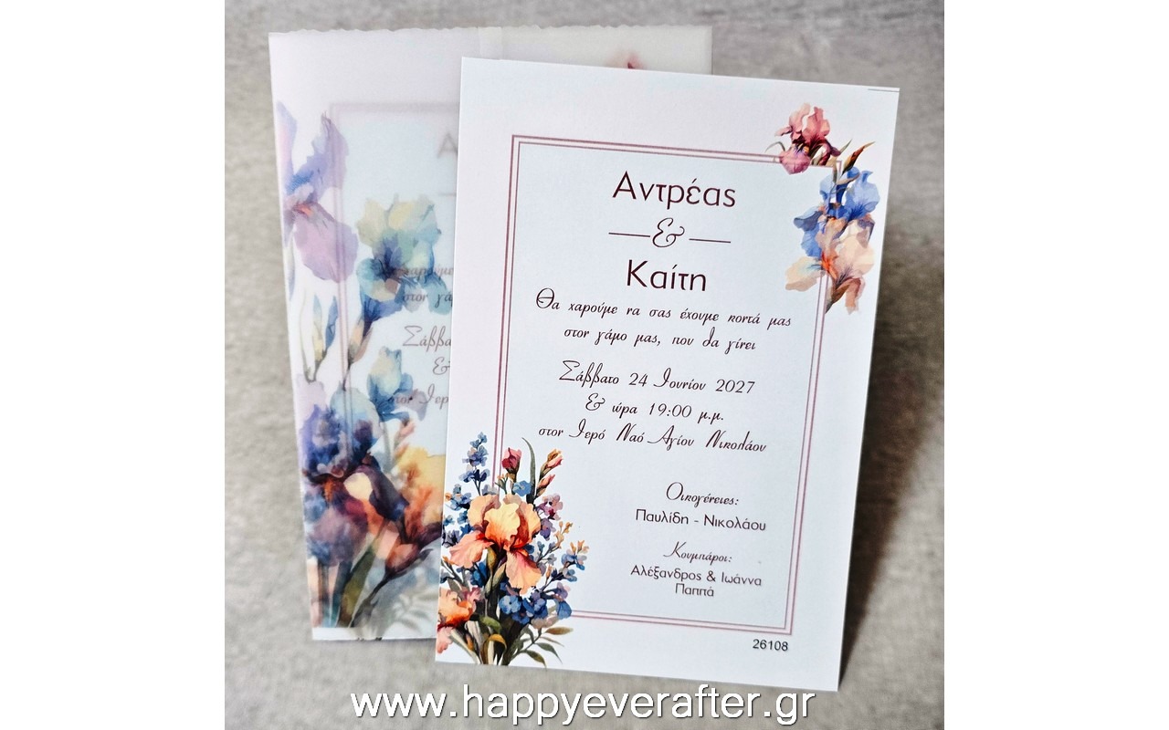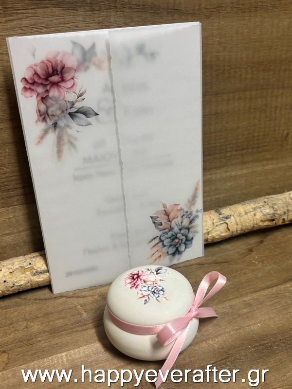 Ελάχιστη παραγγελία 80τμχ. Συνδυάστε το προσκλητήριό σας με μπομπονιέρα με ίδια εκτύπωση (σουβέρ στρογγυλό, σουβέρ τετράγωνο, σουβέρ με plexiglass ονόματα, μπιζουτιέρα μακαρόν, μπιζουτιέρα τετραγωνισμένη).
