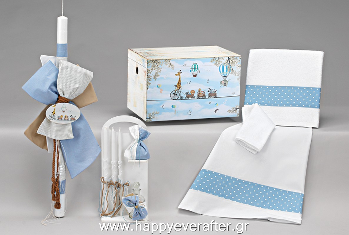 Το σετ συμπεριλαμβάνει ξύλινο ξύλινο κουτί παραλληλόγραμμο με εκτύπωση θέμα “Ζωάκια”, κλασική λαμπάδα βάπτισης με το ίδιο θέμα, λαδοσέτ σε ξύλινη βάση και σετ λαδόπανα εσώρουχα πετσέτες.